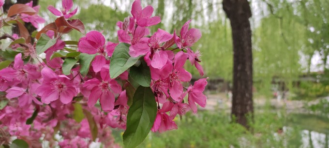 - 海棠花溪。上一次到海棠花溪,正是初春时节,海棠花还没开放,看到树枝上冒出来的一点花蕊,充满春天的生机,而这一次正好是海棠开花的季节,护城河两边满树繁花,海棠中间夹杂着一些桃花,树下、河边都站满了赏花的人。