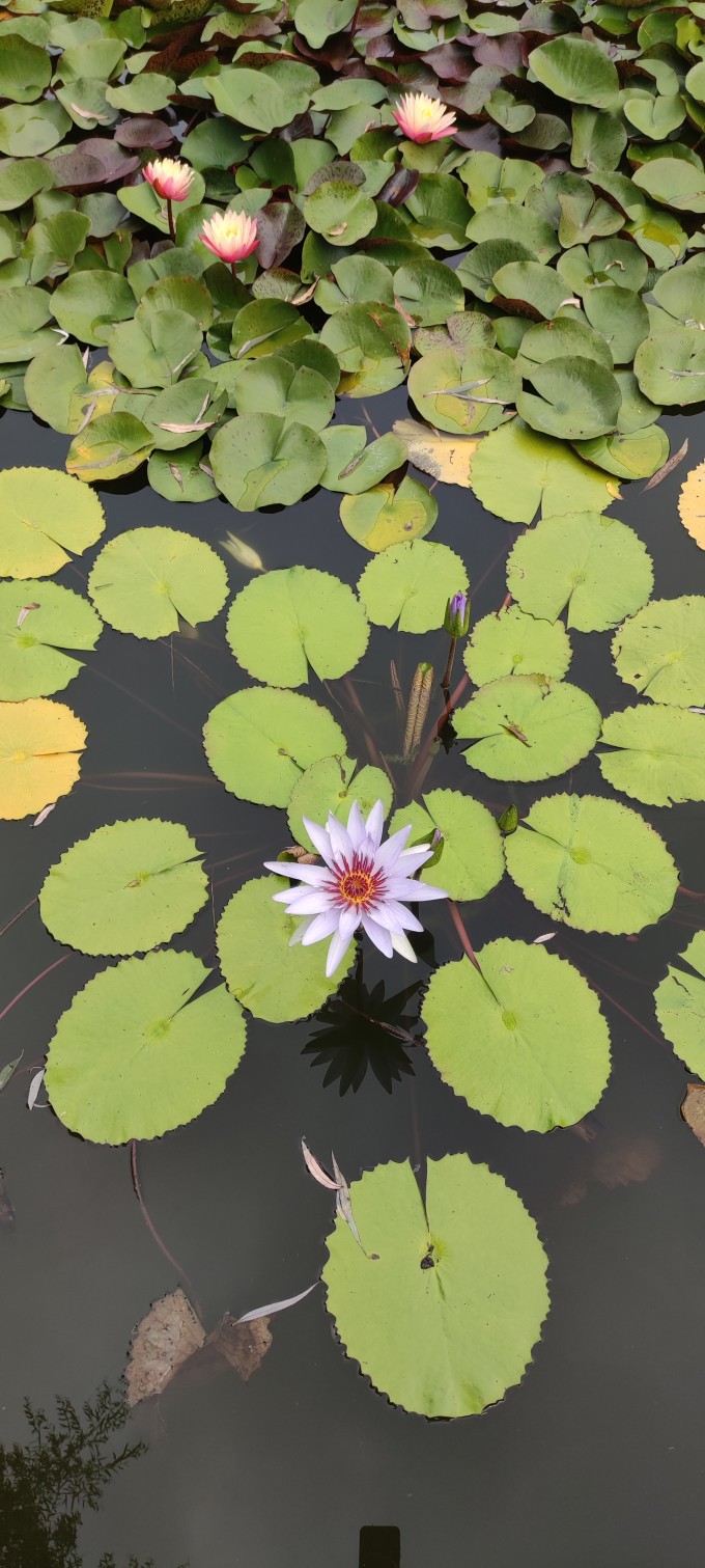 - 植物园的南园是第一次过去,温室里有许多不同地域的植物,但最有意思的还是睡莲。那是间隔了一个夏天的第一次游玩,本来想去看植物园里的古莲池,但夏季已经过去,荷花都已凋谢,还好睡莲正在盛开,南园中间有一个满是睡莲的池塘,大概有三四个品种、五六种颜色,还有不少生长在池边不远处。睡莲颜色更加鲜艳多彩,形状花瓣棱角分明,并且紧贴着水面,多了一些明亮的优雅。